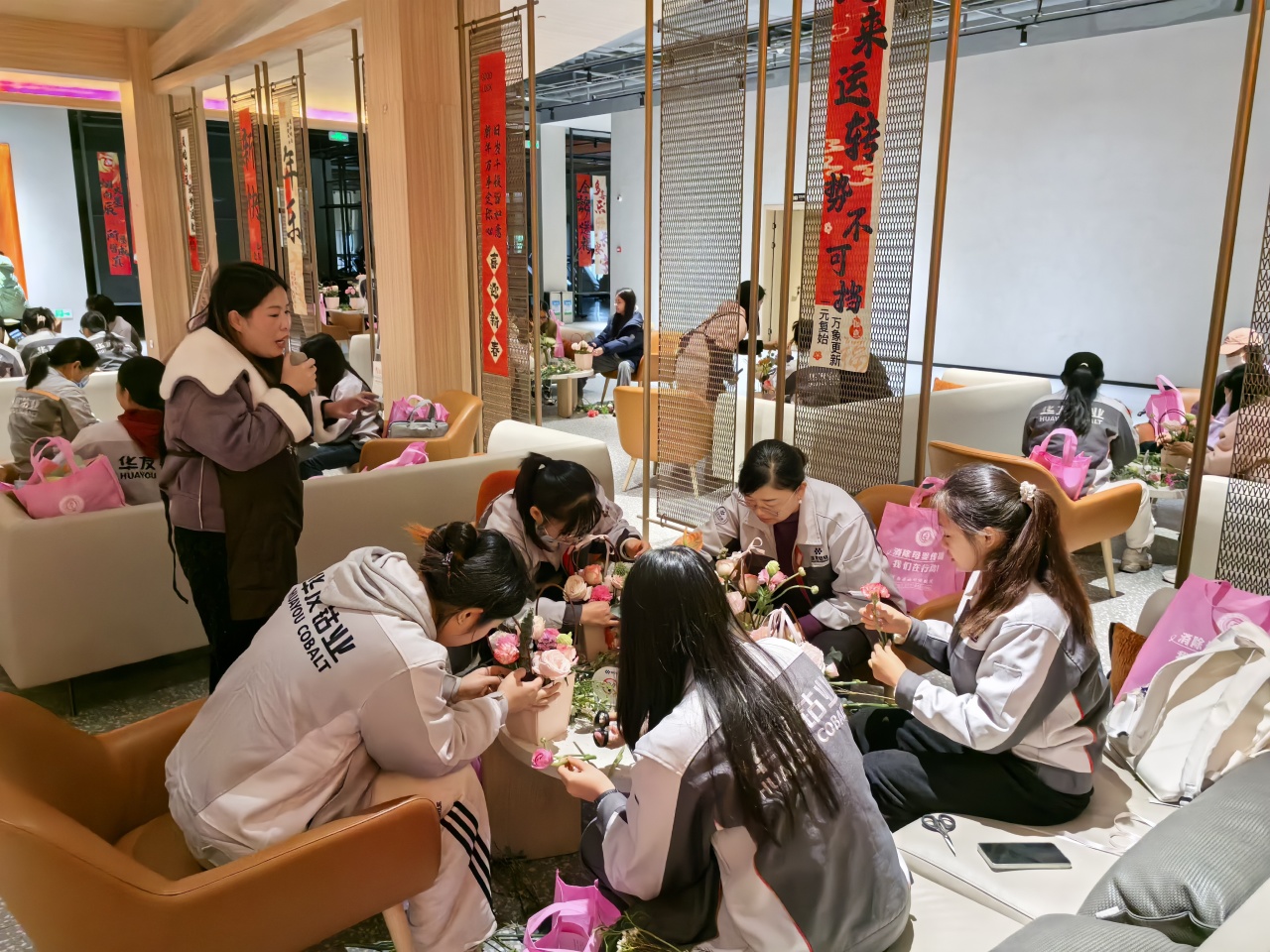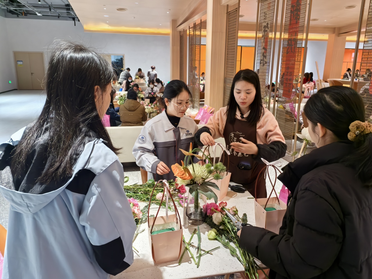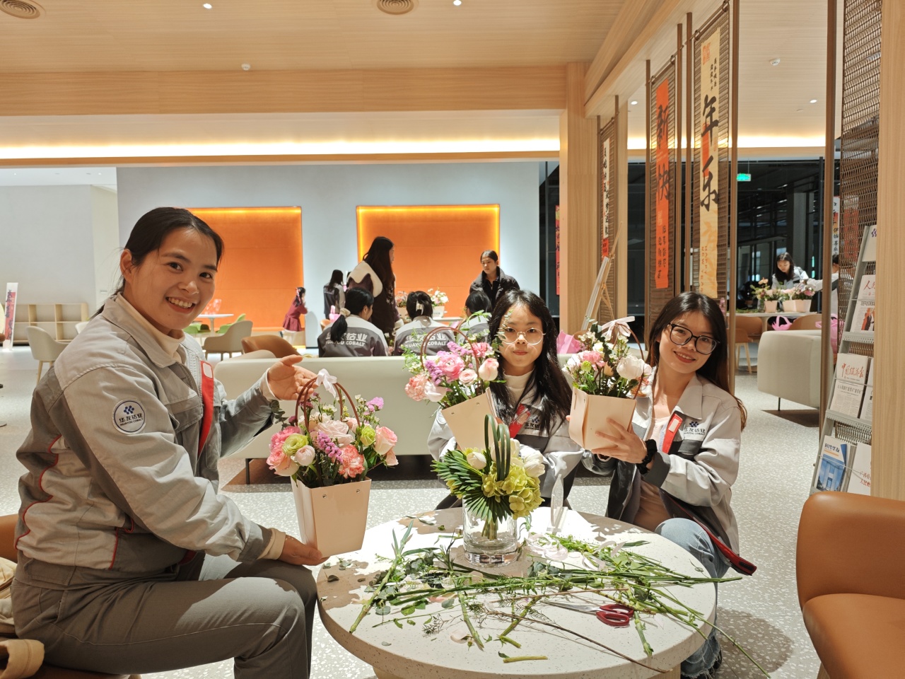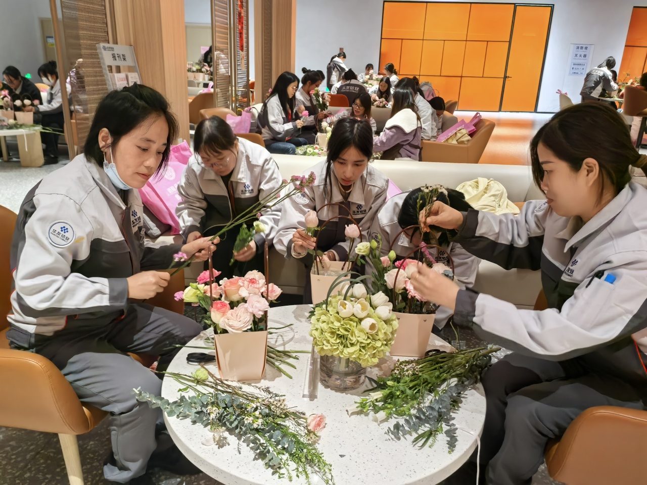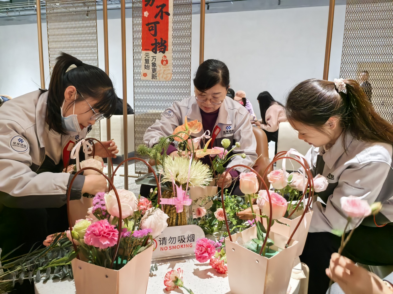 健康講座結(jié)束后,員工們?cè)诨ㄋ噹熤笇?dǎo)下進(jìn)行春日主題插花創(chuàng)作。拆開春日花材包的那一刻,商超休閑中心化作花香彌漫的創(chuàng)作空間。康乃馨的溫柔、洋桔梗的靈動(dòng)、尤加利葉的堅(jiān)韌…… 每一束花籃都是職場(chǎng)女性多重角色的生動(dòng)寫照。