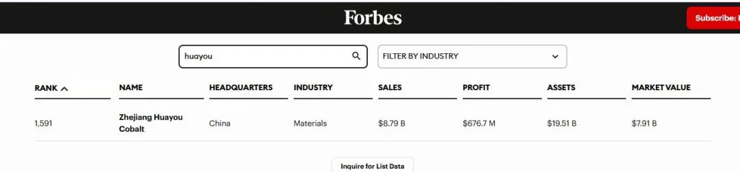 Huayou Cobalt Ranks 1591st on the 2025 Forbes Global 2000 List