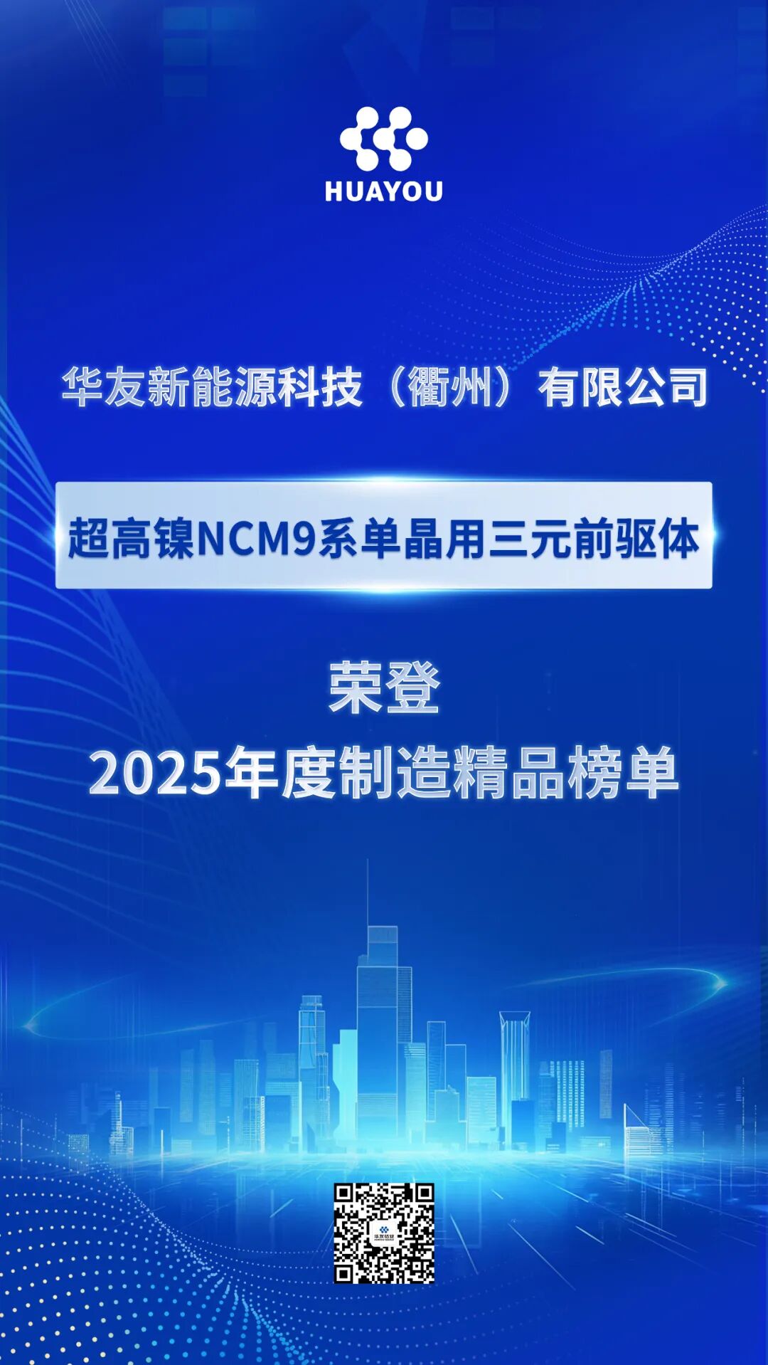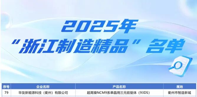 The Zhejiang Provincial Department of Economy and Information Technology recently released the 2025 "Zhejiang Made High-Quality Products" list. Huayou New Energy Technology (Quzhou) Co., Ltd.'s independently developed "Ultra-High Nickel NCM9 Series Single Crystal Ternary Precursor (93DS)" earned a spot on the list, recognized for its technological innovation, leading performance, and market competitiveness. This honor validates Huayou's R&D capabilities and its contributions to advancing high-end, green development in the new energy materials sector, marking a breakthrough in China's high-performance lithium-ion battery cathode material precursor industry.