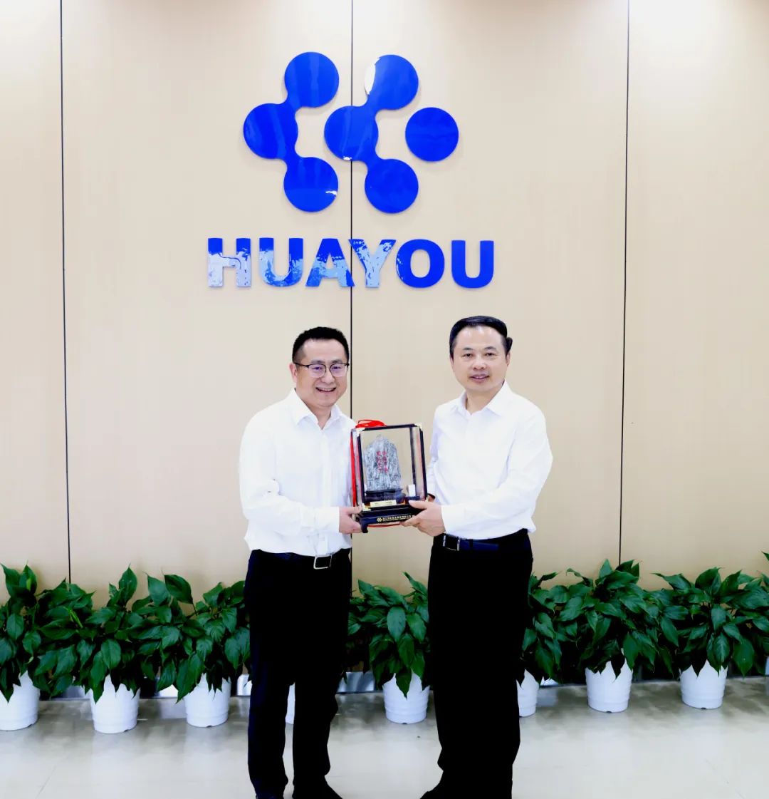 方圓代表陳雪華董事長,向張天任董事長贈送了極具華友特色的紀念品——《友石同輝》。該紀念品礦石來自華友津巴布韋Arcadia鋰礦,上刻“根在中華 友遍天下”,體現了華友的家國情懷和商業理想,并在原石一側擺放了由華友鋰業(廣西)公司生產的碳酸鋰產品,體現了華友“資源在海外、制造在中國、市場在全球”的產業布局。張天任饒有興趣地詢問了紀念品的設計理念,表示了誠摯感謝。