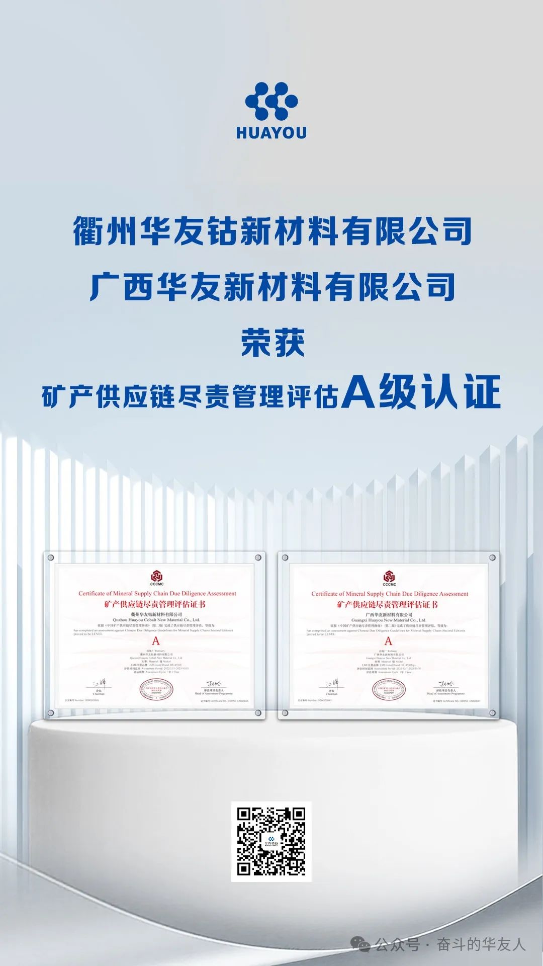 衢州華友鈷新材料有限公司和廣西華友新材料有限公司電鎳率先通過礦產供應鏈盡責管理評估,中國五礦化工進出口商會頒發了礦產供應鏈盡責管理評估A級證書。