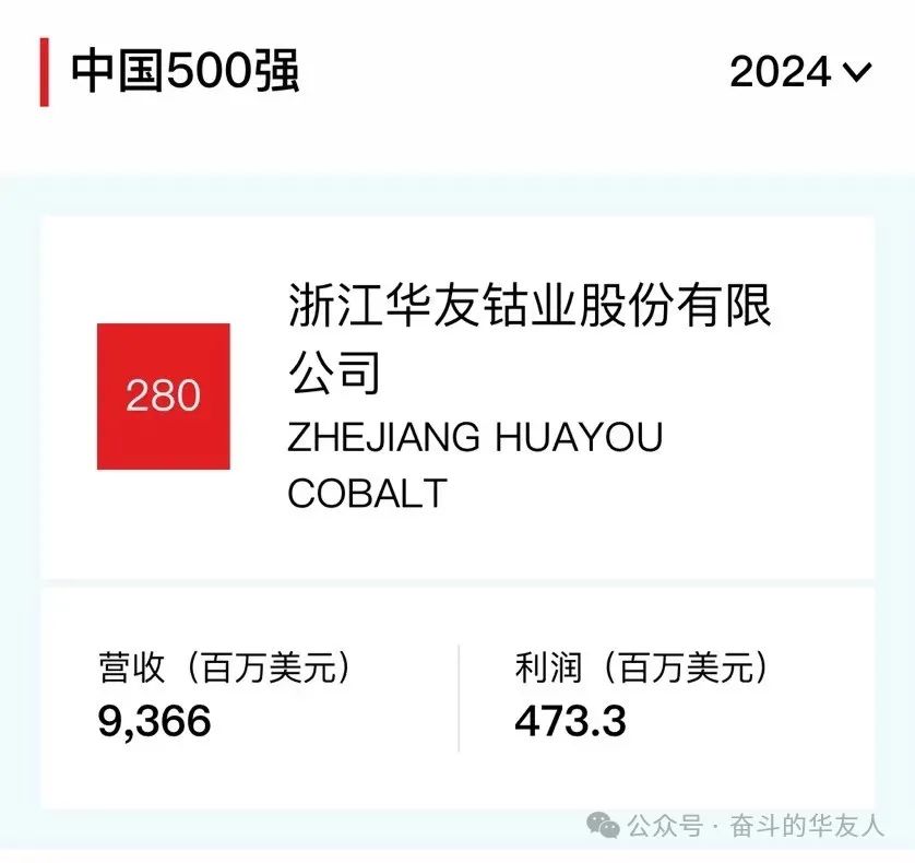 《財富》中國500強,華友鈷業位居第280位!