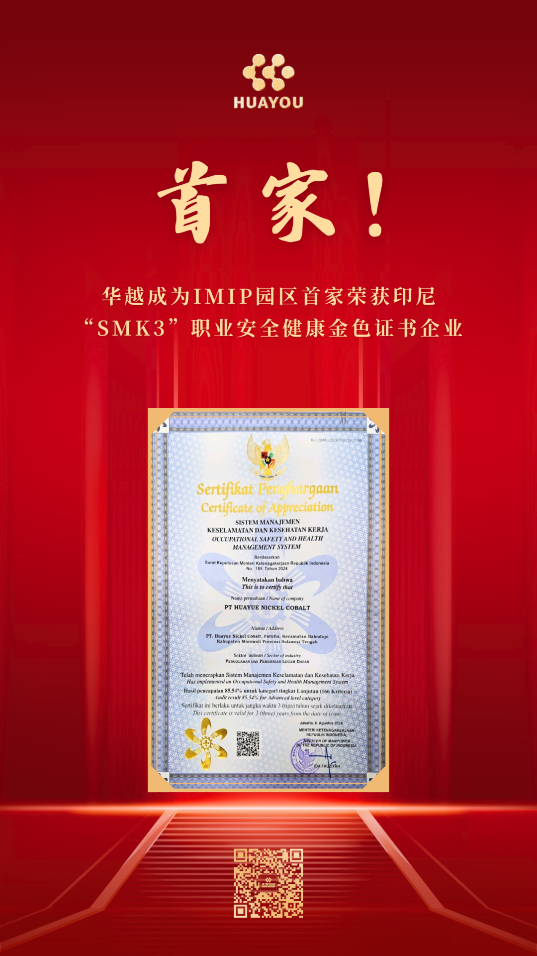 9月9日,華越鎳鈷(印尼)有限公司正式通過審核,獲得印尼勞工部頒發(fā)的“SMK3職業(yè)安全健康”金色(最高等級)證書,成為IMIP園區(qū)50多家企業(yè)中首家獲此認(rèn)證的企業(yè)。